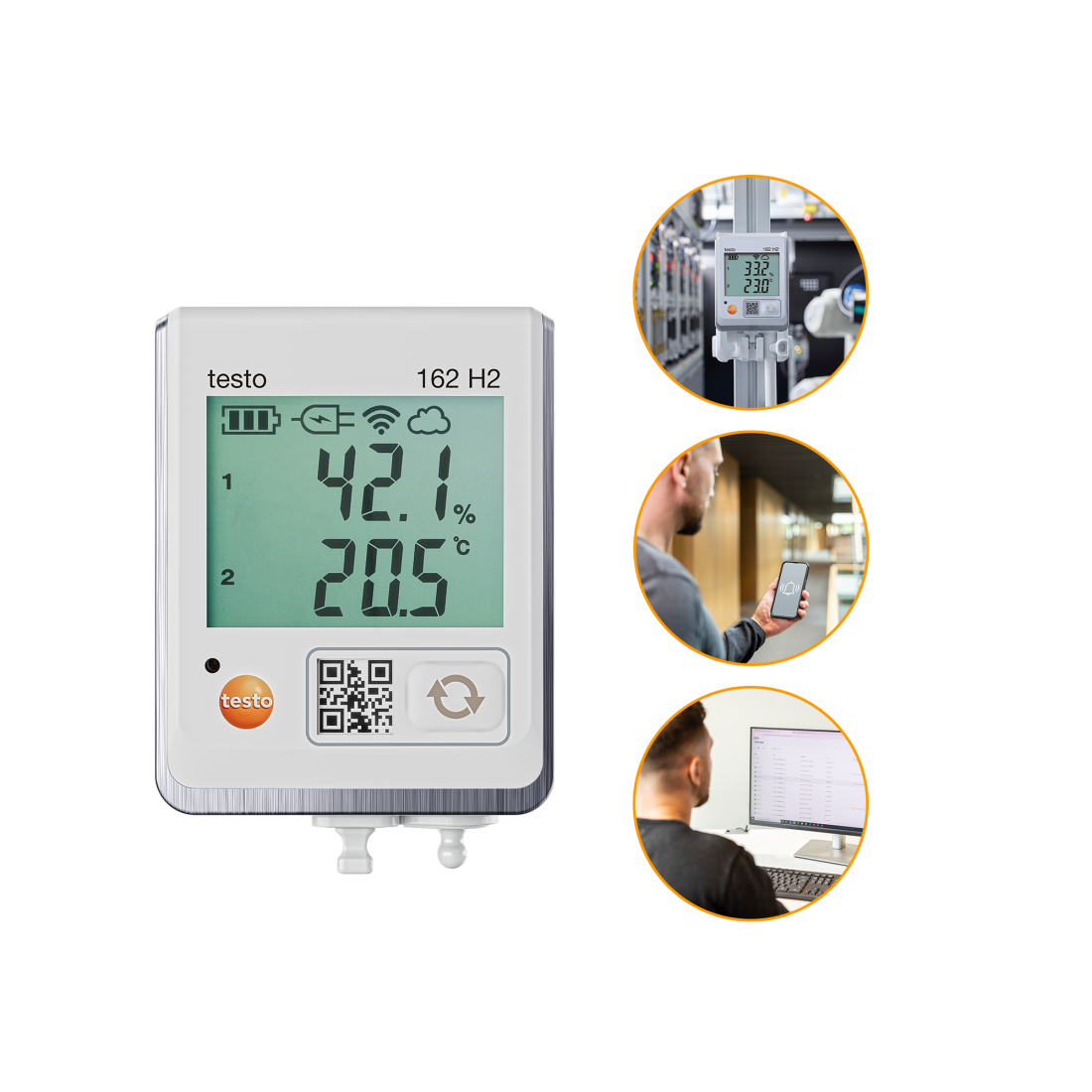 Τα ασύρματα καταγραφικά δεδομένων testo 162 αποτελούν μέρος του online συστήματος καταγραφής δεδομένων testo 160. Καταγράφουν τιμές μέτρησης (θερμοκρασία, υγρασία και CO2) και τις αποστέλλουν απευθείας στο testo Saveris Cloud μέσω σύνδεσης WLAN.